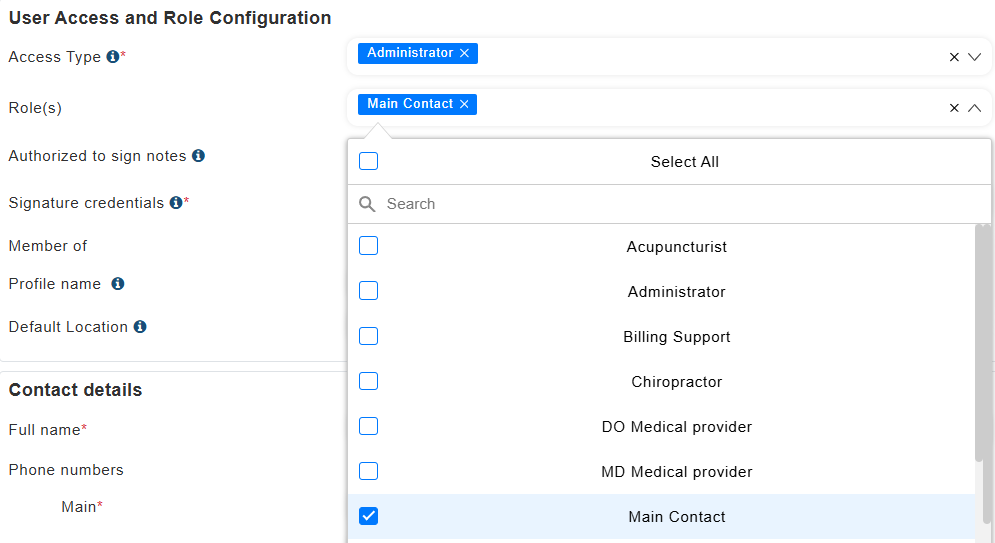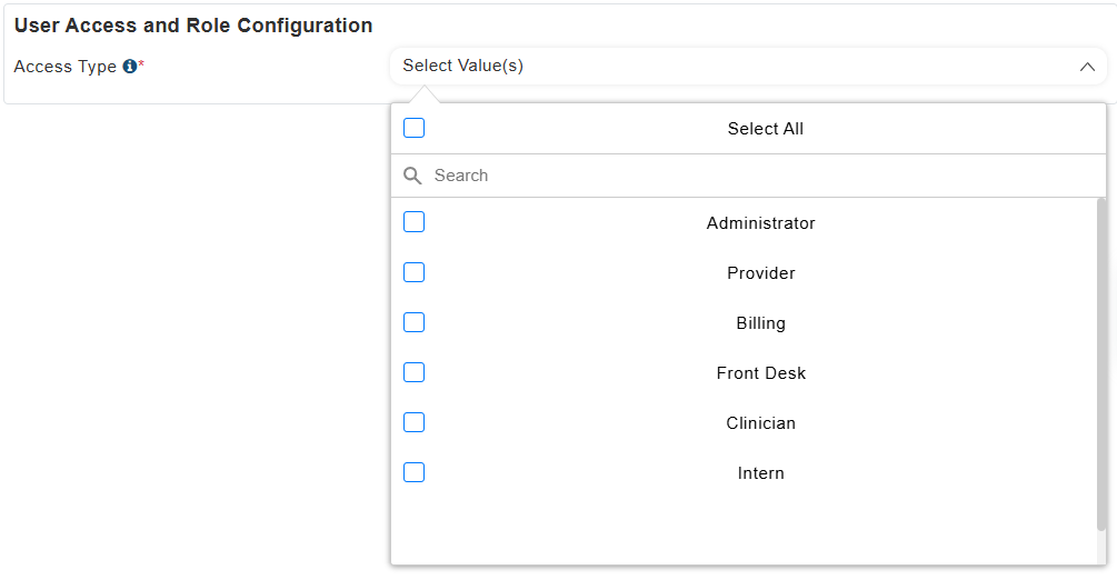 - Once you have selected the Access Type, you can also determine the user's role. The 'role' is for internal purposes only and does not control the user's access within the software.