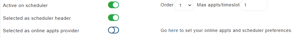 - Max Appts/Timeslot: Controls whether multiple appointments can be booked in the same time slot for this provider.