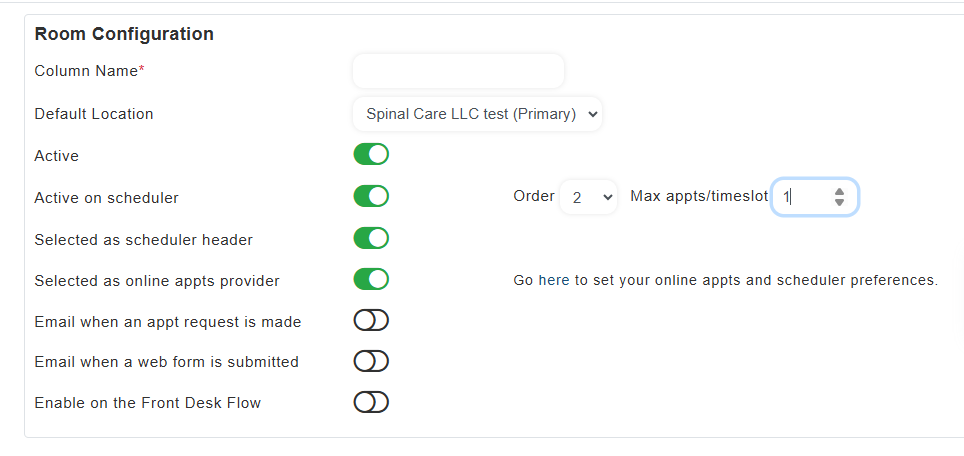 - Set the room to appear on the Scheduler and/or the Front Desk (if you will be scheduling to rooms, and/or only using the rooms for check-in purposes)