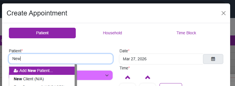 - It starts on Patient Appointment, you can tab to "Household" (Schedule a Household) or "Time Block" (block off time for a provider).