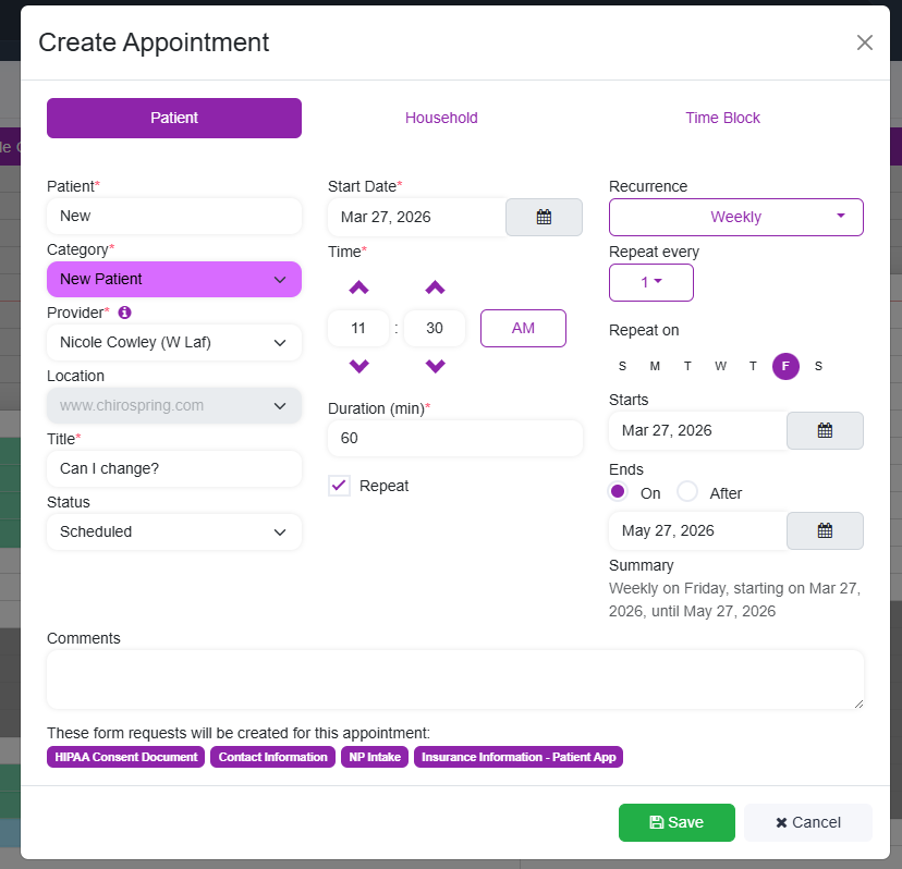 - Edit duration if needed, it will default to duration set by the Appointment Category selected