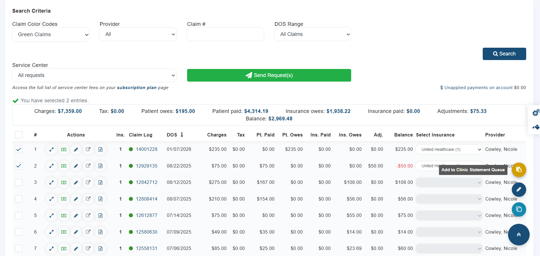 - Go to the Claim History of any Patient's record and you can select the dates of service you want to send a statement to the patient for. Once selected, hover your action arrow and click "Add to Clinic Statements Queue"