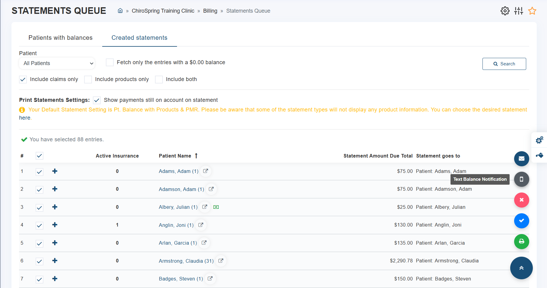 You can send statements via email, SMS or PDF/Print. If you use ChiroSpring Pay your patients can pay their balances with a payment link. *For instructions on sending a $0 balance statement, scroll down to steps on creating statements from your Aging Report.