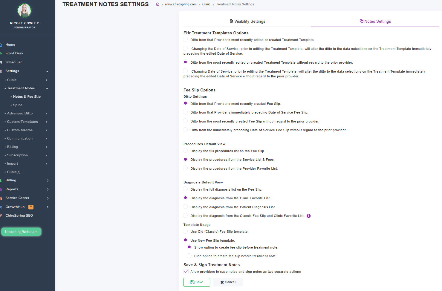 SETTINGS - TREATMENT NOTES - NOTES & FEE SLIP (Notes Settings Tab)
