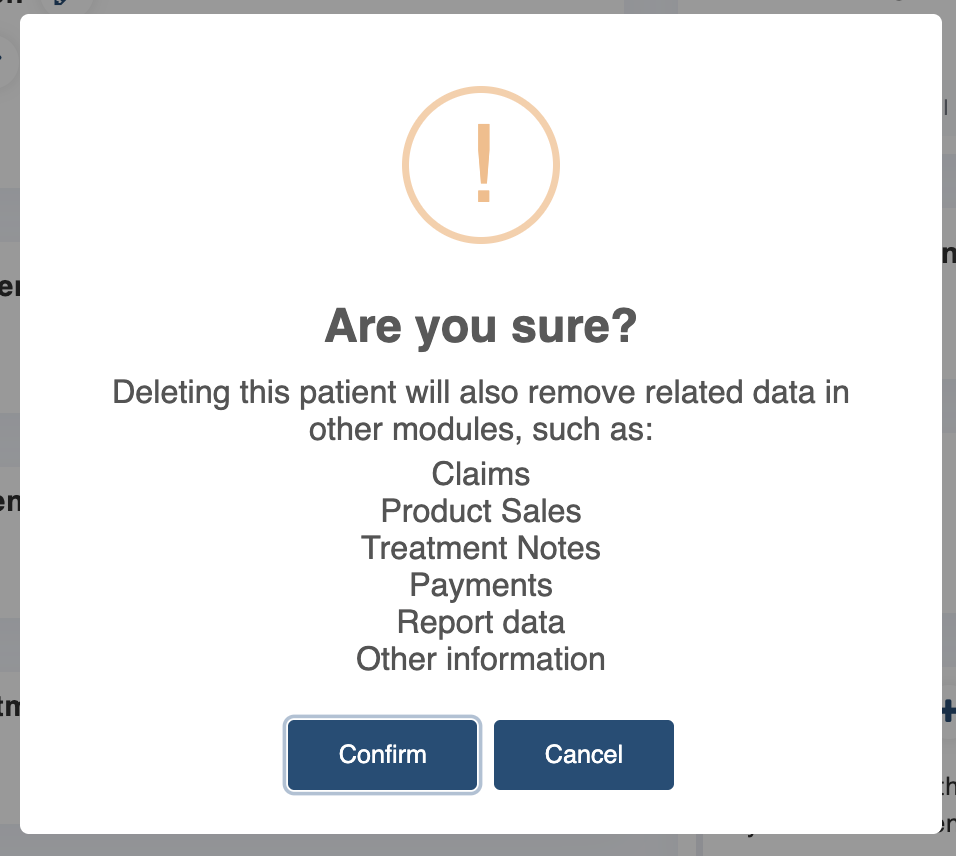 - Confirm after reviewing the information in the dialog. If you are okay and want to proceed, click "Confirm". The patient is now deleted.