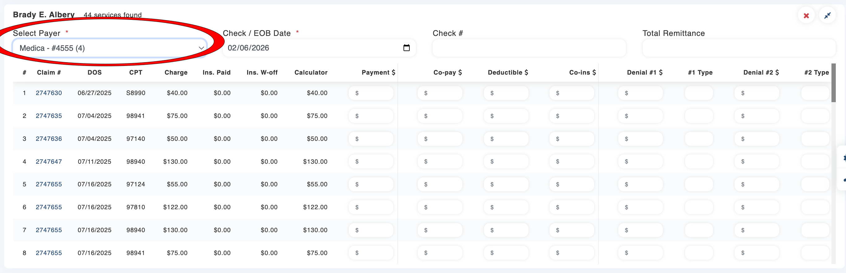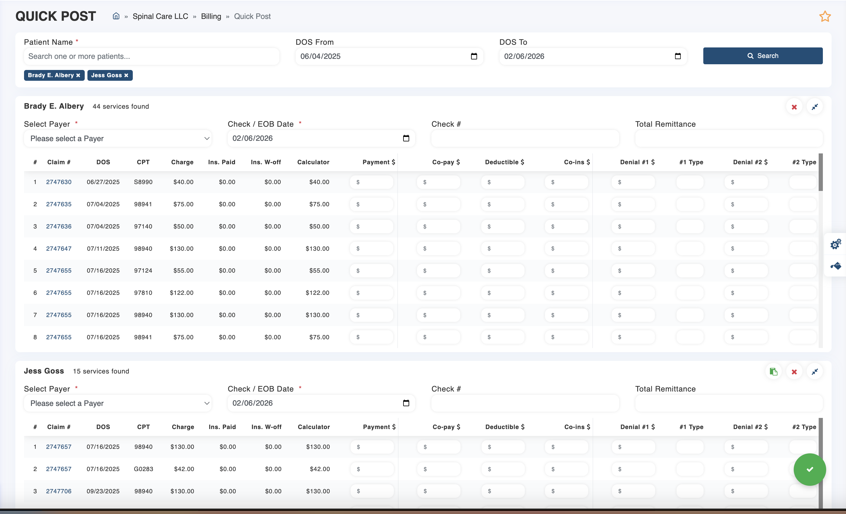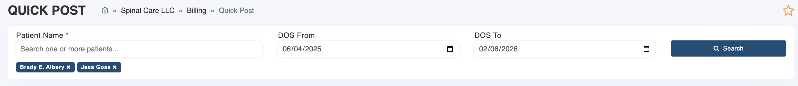 Next, enter the start and end dates from the remittance. Then click "Search". This will load all outstanding claims for your selected patient(s) that fall within that date range.