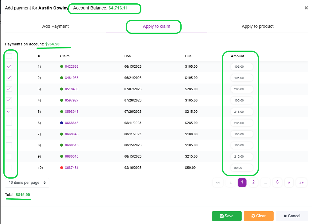 - Select the checkbox next to the claim or product you want to apply the payment to.