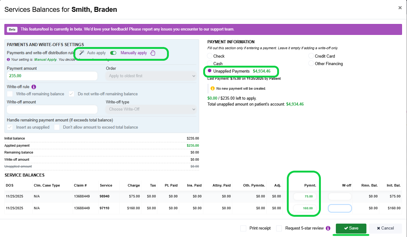 - Enter payment amounts (and/or write off amounts) in the ledger boxes