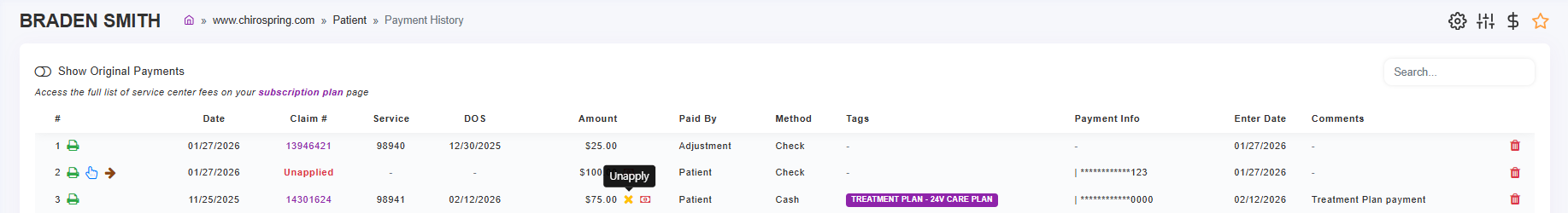 ChiroSpring allows payments to be applied to claims or products from several areas within the patient record. Payments can also remain unapplied until you decide where they should be allocated.