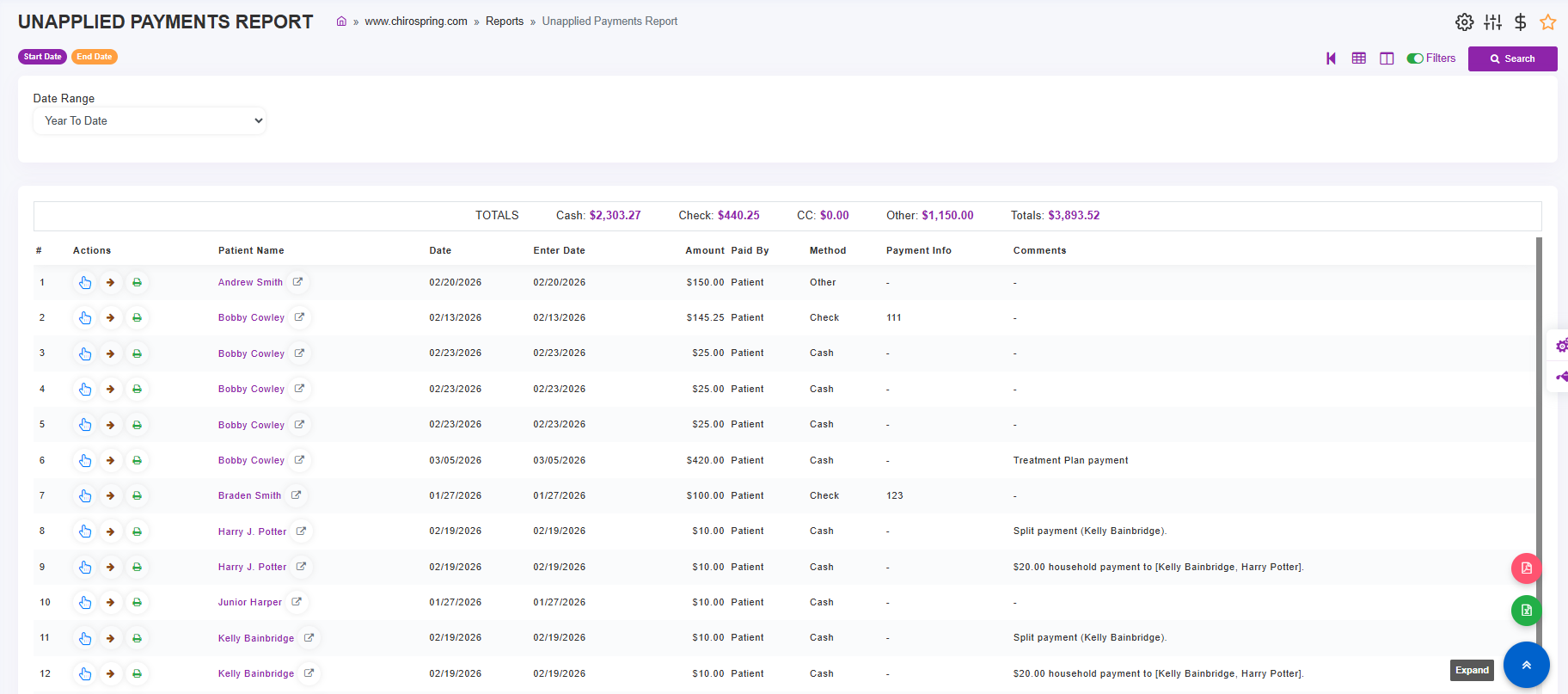 ChiroSpring provides several ways to apply payments to a patient’s account. To support different clinic workflows, Quick Links to payment tools are available throughout the system, including within dynamic reports and customizable user screens. These options allow staff to quickly apply payments from the area of the software where they are already working.