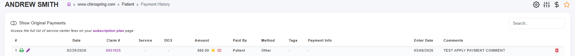 - Patient Payment History will have a line item with the applied payment and associated comments/tags