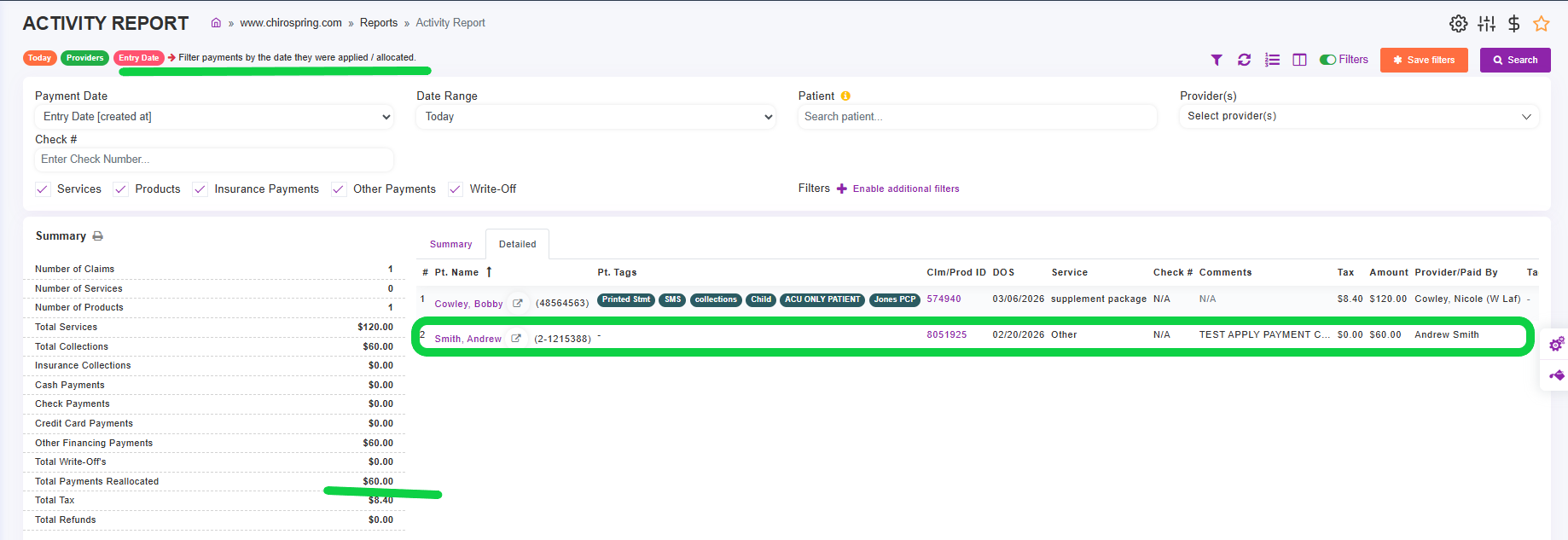 - The action taken today logs in Entry Date report because it was applied today, you can see it listed to the left too, as Total Payments Reallocated