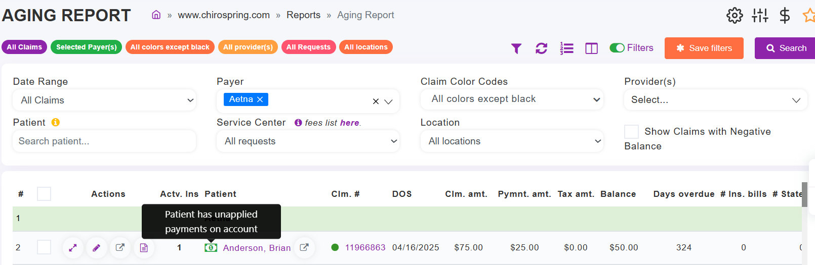 When you are in the Aging Report, you will see a Dollar Bill Icon next to names of patients with Unapplied payments on their account