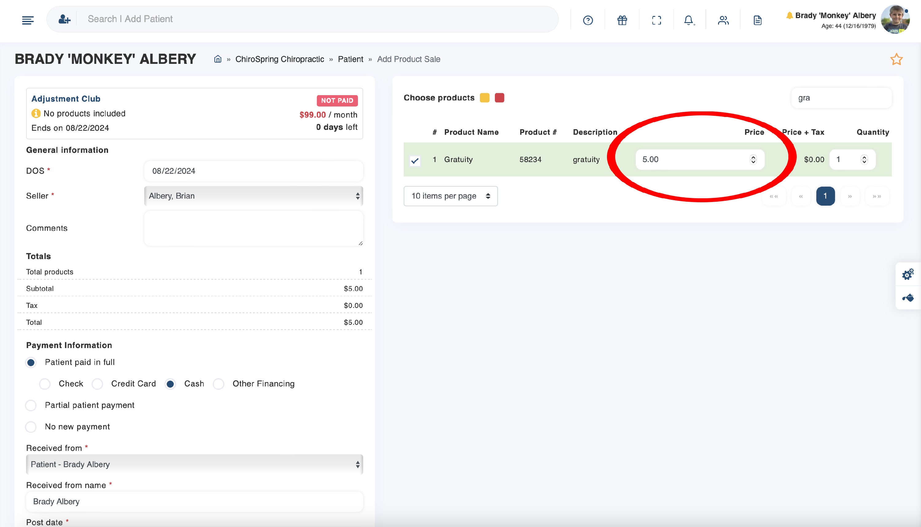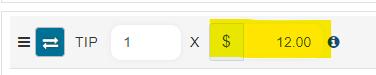 Next search for "Gratuity" at the top. Then edit the price as shown below. In this example we have edited the price to $5.00.