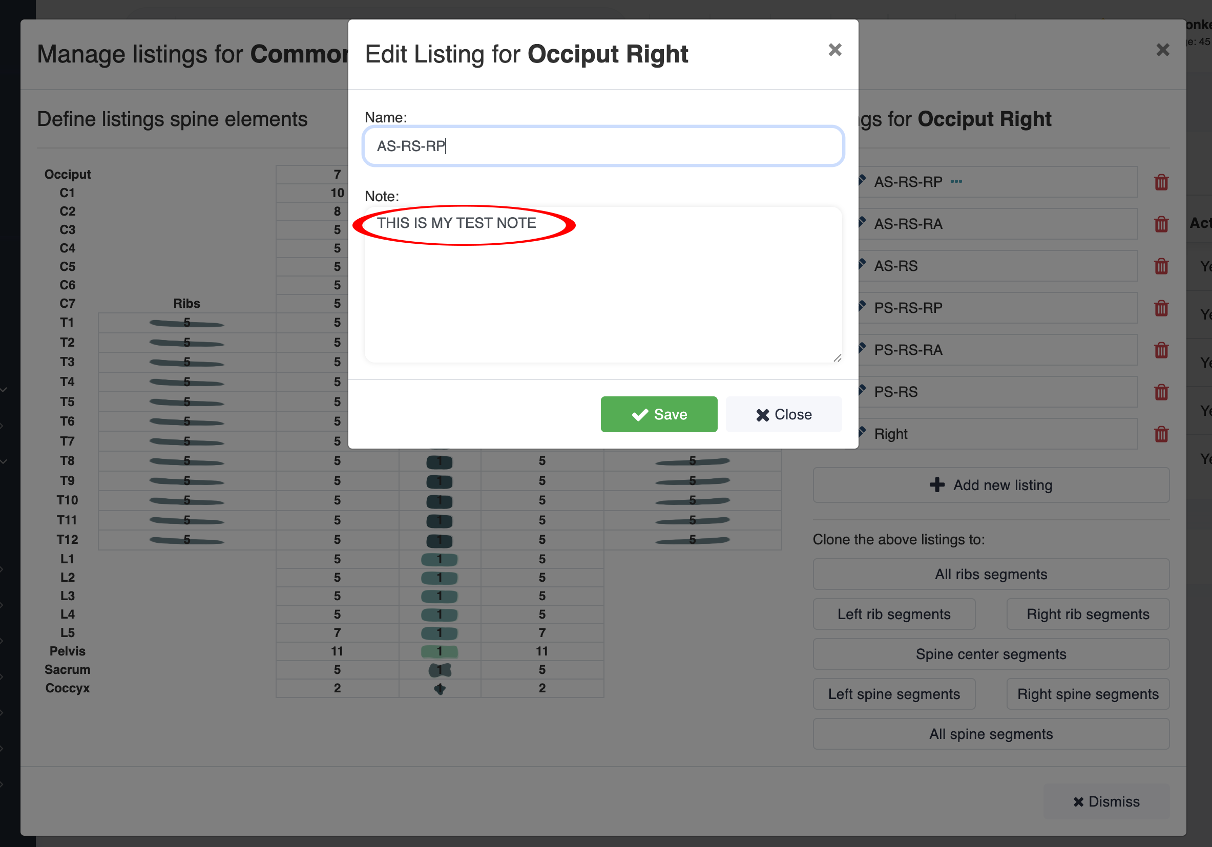 Now that you have clicked the Edit Listings option you will see a dialog with the full spine and ribs. The spine is displayed with the patient in the prone position (laying face down on the adjusting table).