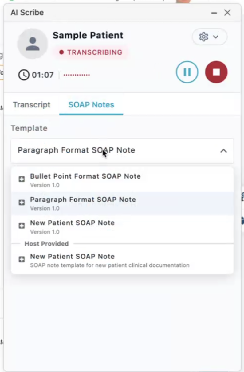AI Scribe will output your dictation based on the template selected. On the SOAP Notes tab select from one of the following templates. We like to recommend the Paragraph Format SOAP Note as our favorite.