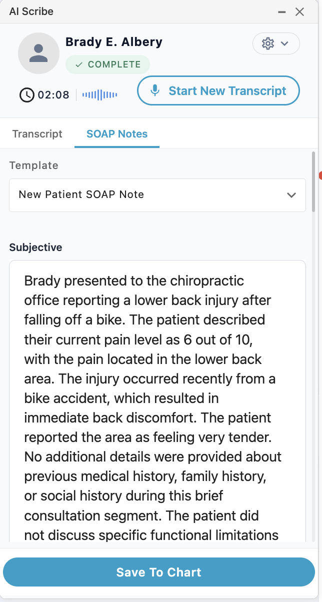 When you have finished your patient encounter, click the stop button. In just a few seconds the transcript is transcribed into a full SOAP note.
