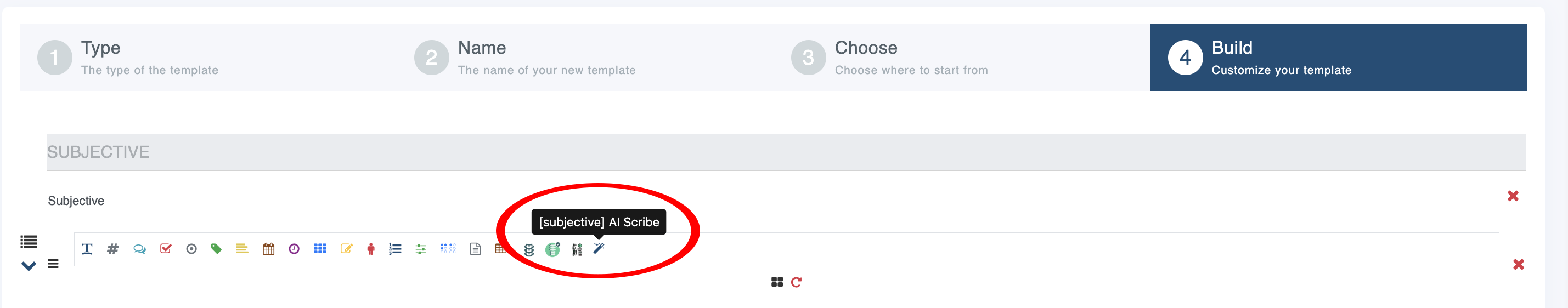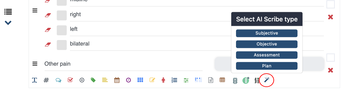Adding AI Scribe to your template is super easy. Choose the magic wand icon. Then choose the section you want to use in that part of your note.