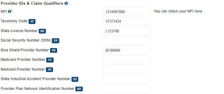 Each field displays the correct CMS qualifier code to ensure claims generate with the proper formatting.
