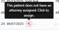 - A small attorney icon now appears in the patient list if no attorney is assigned, the tooltip clearly prompts: “This patient does not have an attorney assigned. Click to assign.”