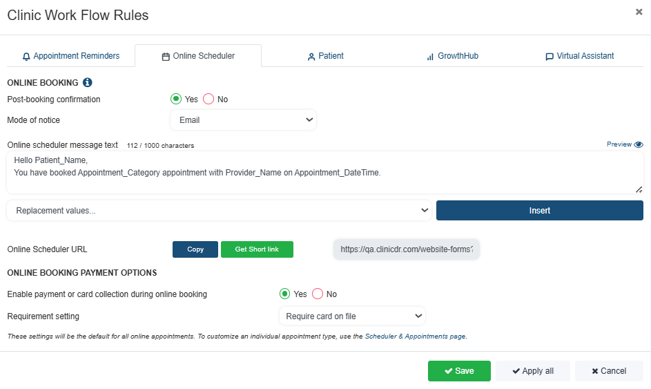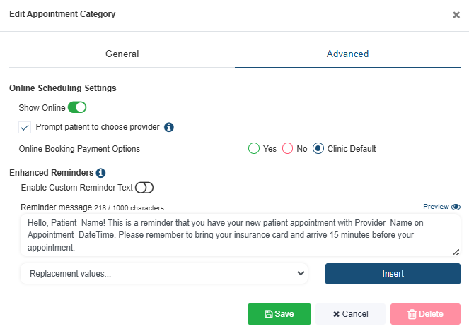 Settings - Clinic - Scheduler & Appts - Edit Appointment - Advanced - Online Scheduler Options