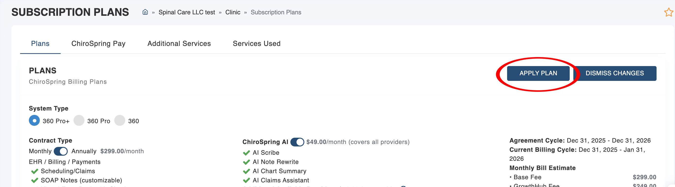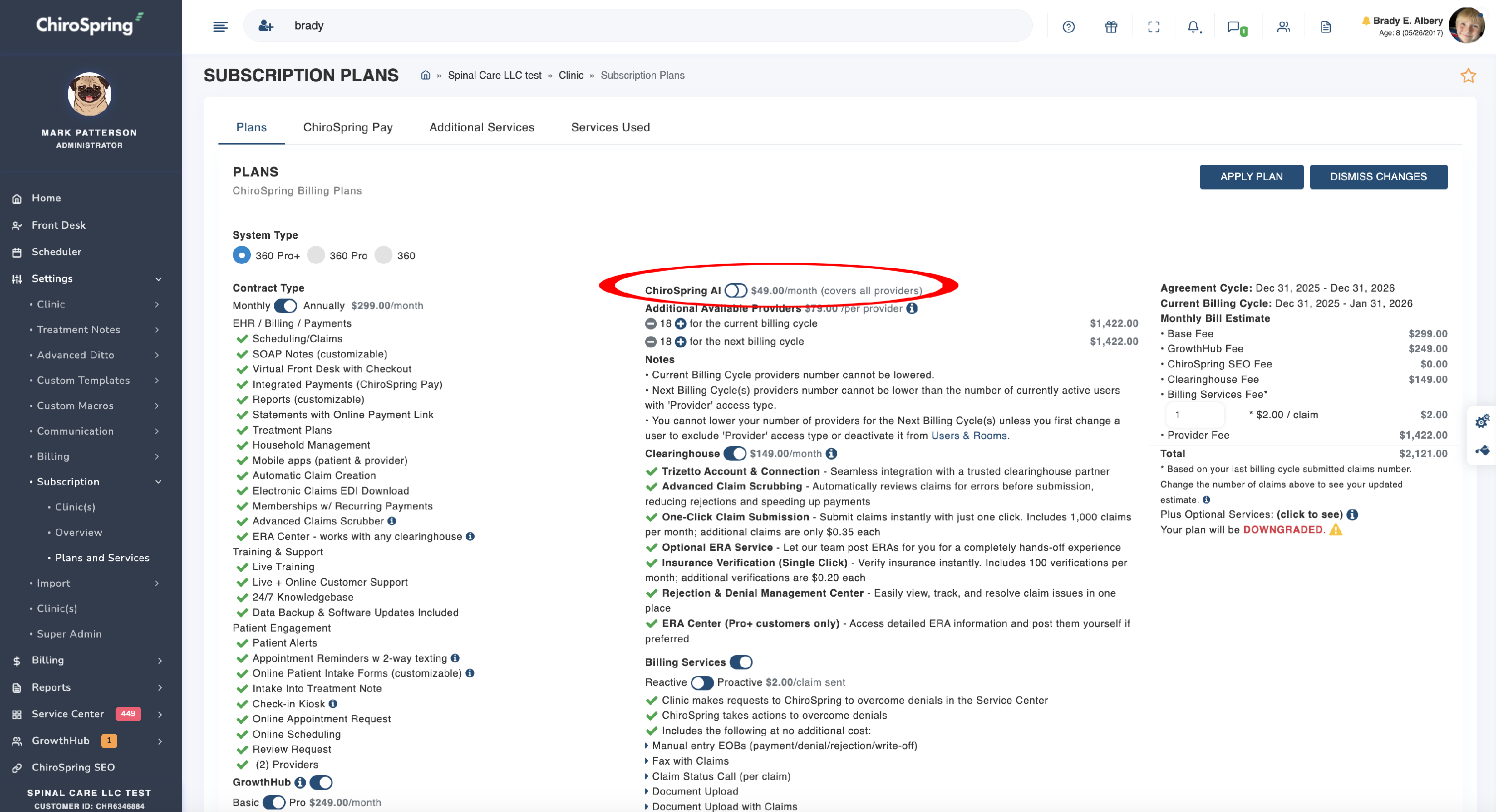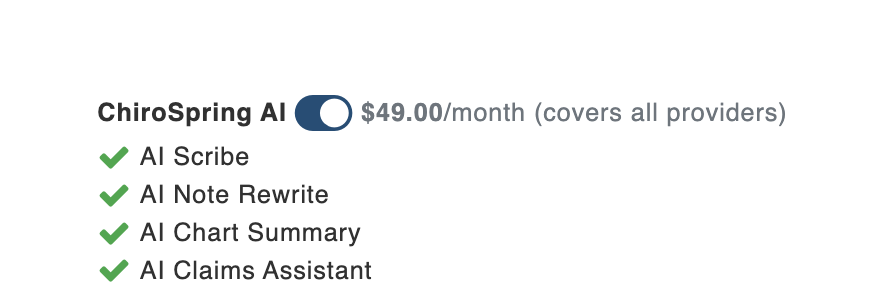 To add ChiroSpring AI to your practice go to your subscription overview page. Then click "Change Plan" and add ChiroSpring AI.