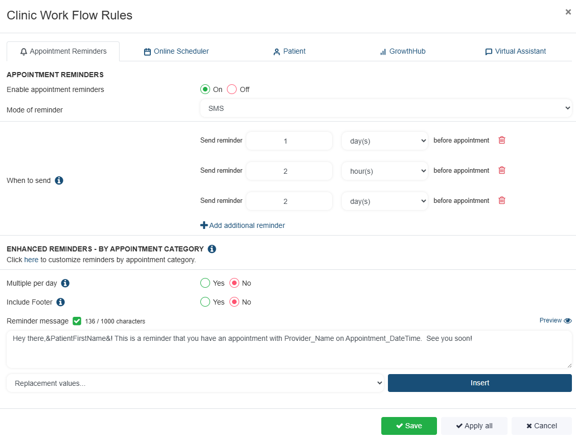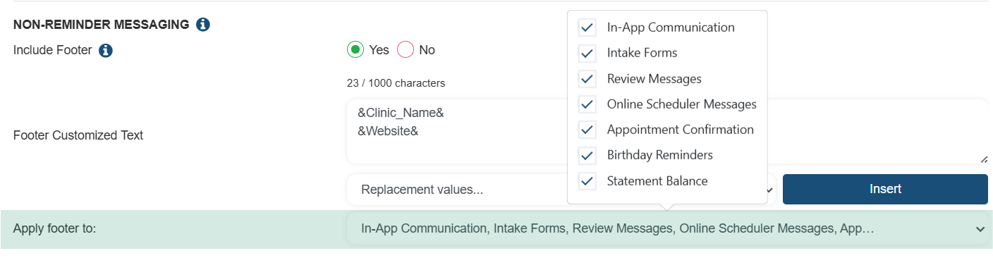 - Non-Reminder Messaging: Allows you to include a Footer Message with particular system automated texts: