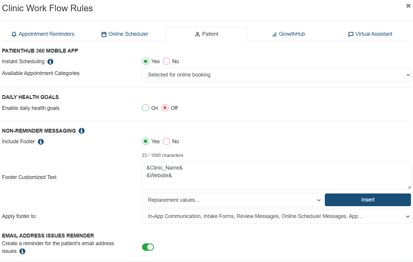 - The "Patient" tab applies to additional Patient Communication settings including the patient Mobile App: