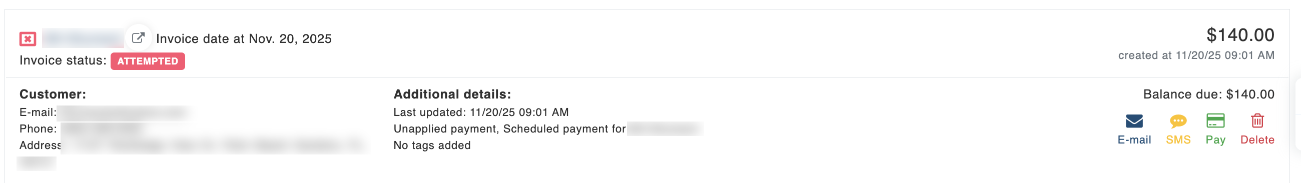 If you click on a payment you will see options. Use the action buttons to resend the payment (E-mail or SMS). Or, use the Pay option to take payment directly from the patient. Finally, if you want, you can delete the payment attempt.
