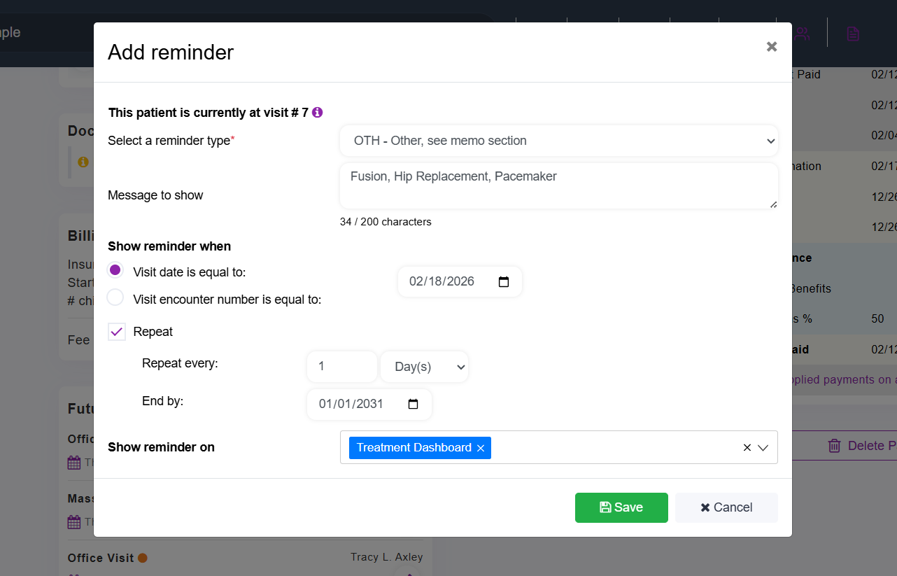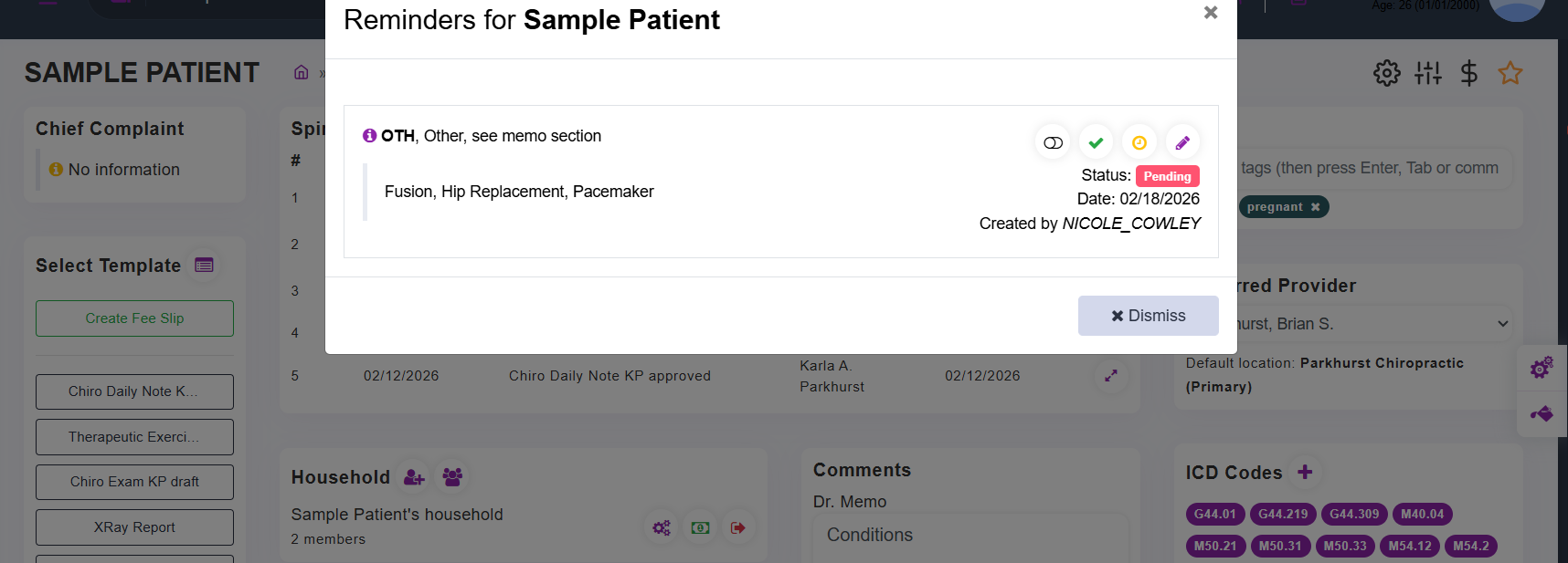 You can set a pop-up patient care reminder through the patient Treatment Dashboard. Many providers like this as it pops up for them as soon as they open the patient's account (and/or in many other places too- you choose!)