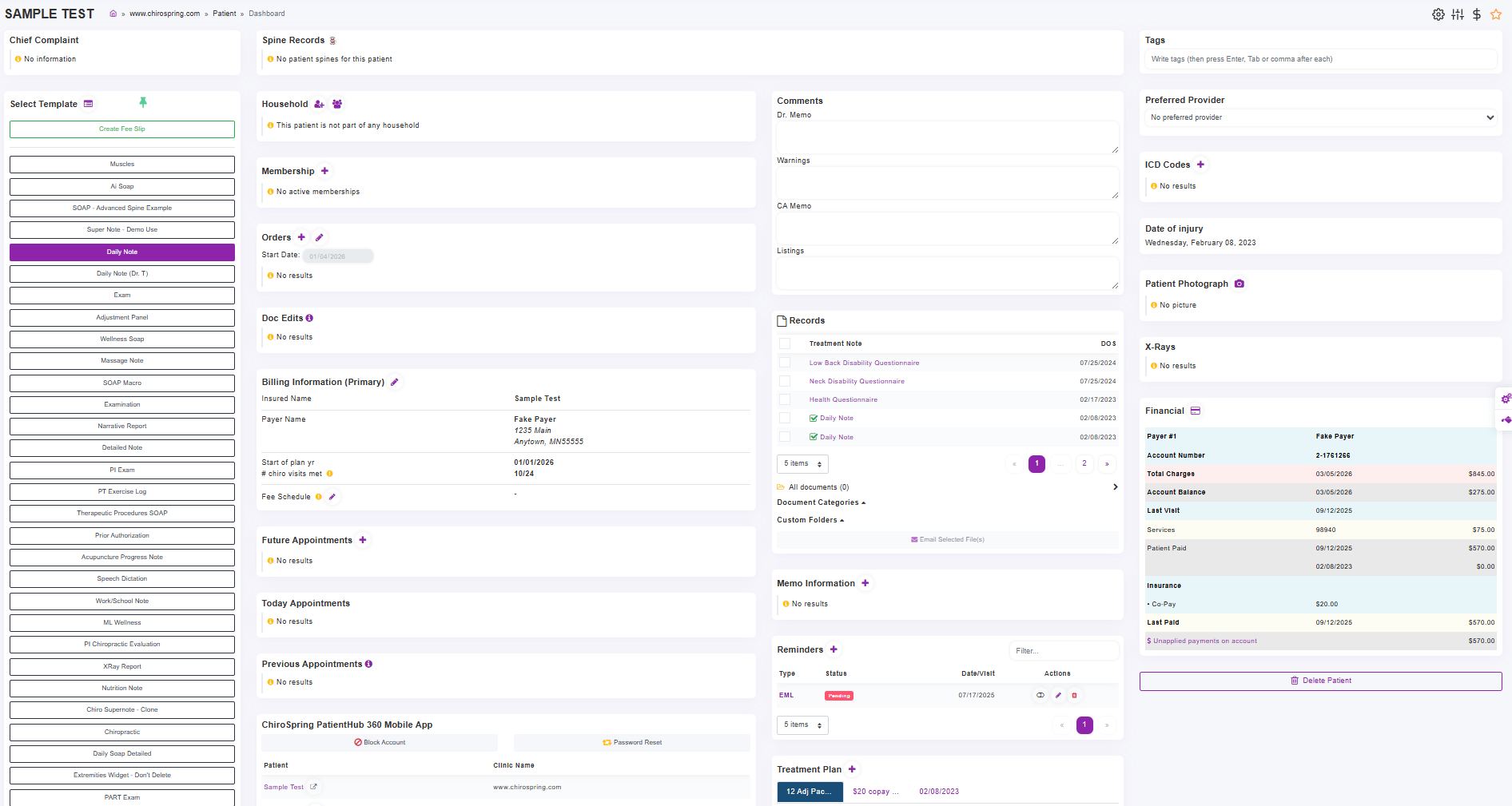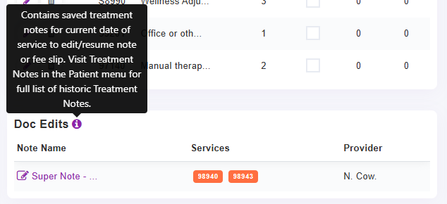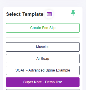 - Provider Note Templates checked on for Treatment Dashboard will show here in order you chose. The Create Fee Slip will be an option based on your Clinic Settings. The purple icon next to "Select Template" will open all of your active templates.