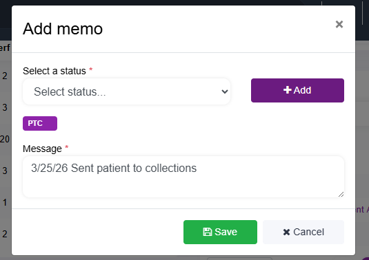Allows you to add a Memo/Status to Patient File - This can also be seen in the Billing Dashboard, the last memo in the Attorney Report