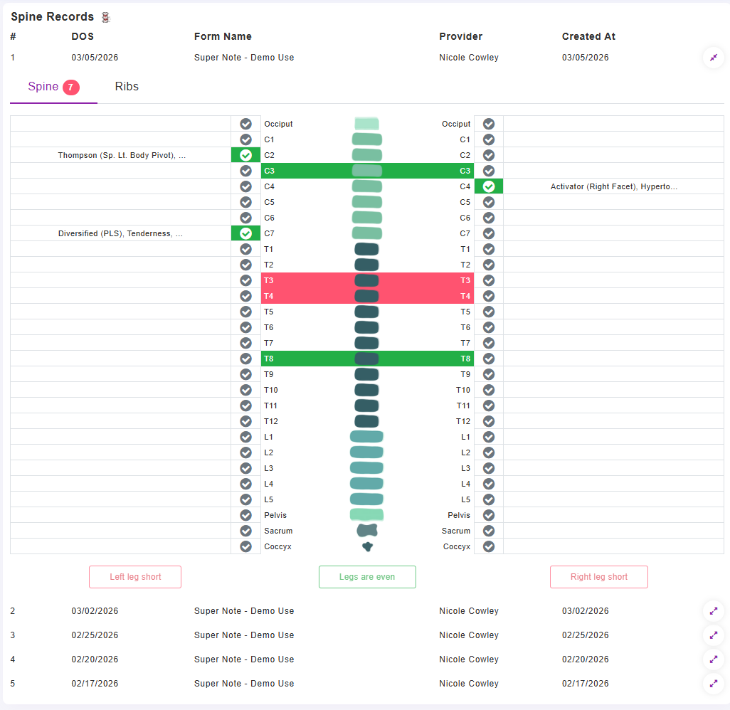 - Quick View for Adjustment History from using Basic or Advanced Spine: This panel will show the previous (up to 5) visits Spine Documentation. You can use the small arrows to the right to Expand and Collapse the quick views