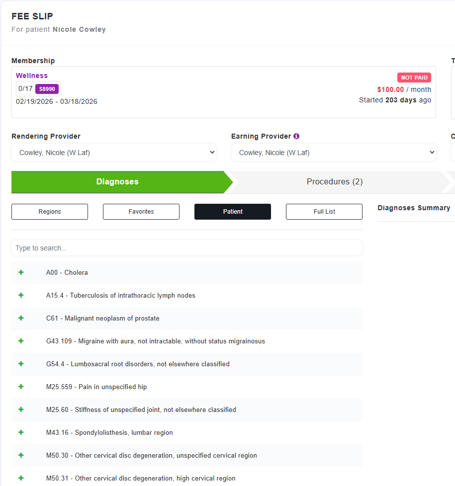 Displays diagnosis codes historically associated with the patient (used on Previous Fee Slips/Claims or Imported over from Previous EHR).